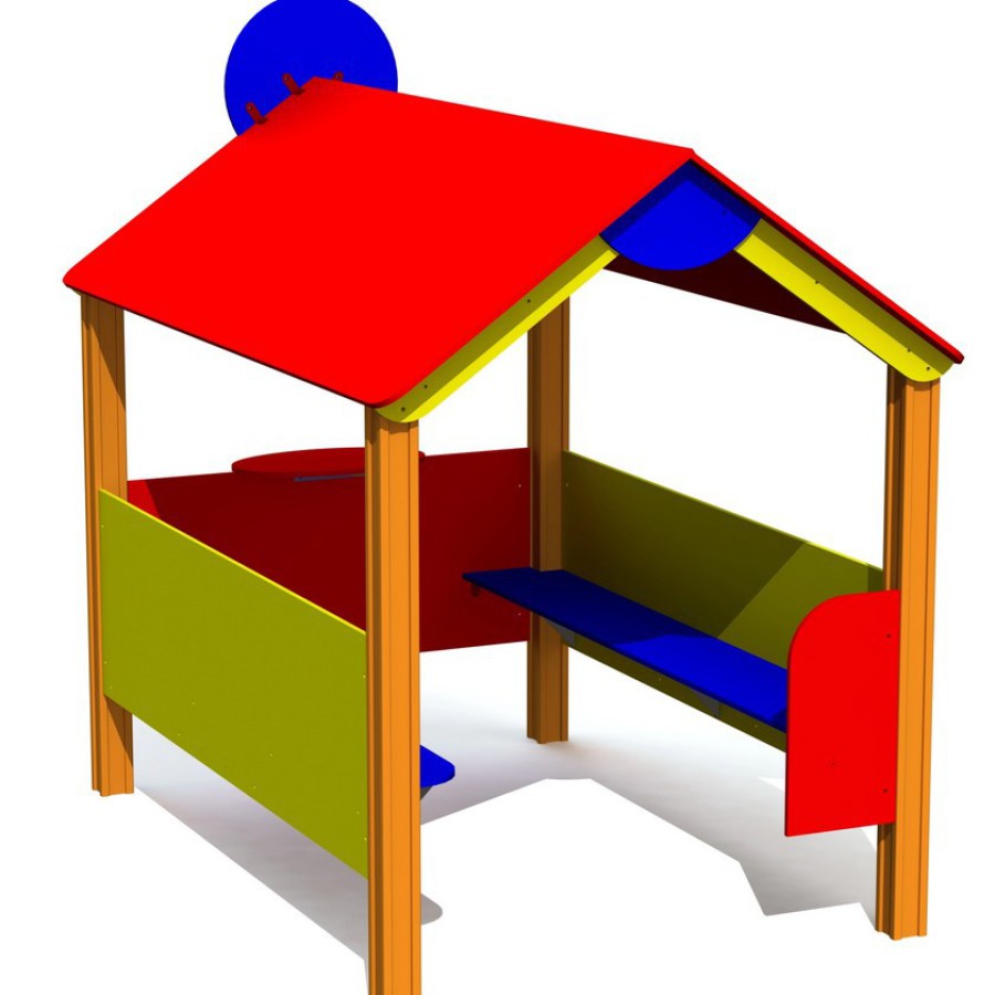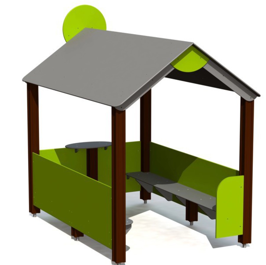 Komfortables Spielhaus mit Bank und Spieltisch – ideal zum Verweilen und fantasievollen Spielspaß.