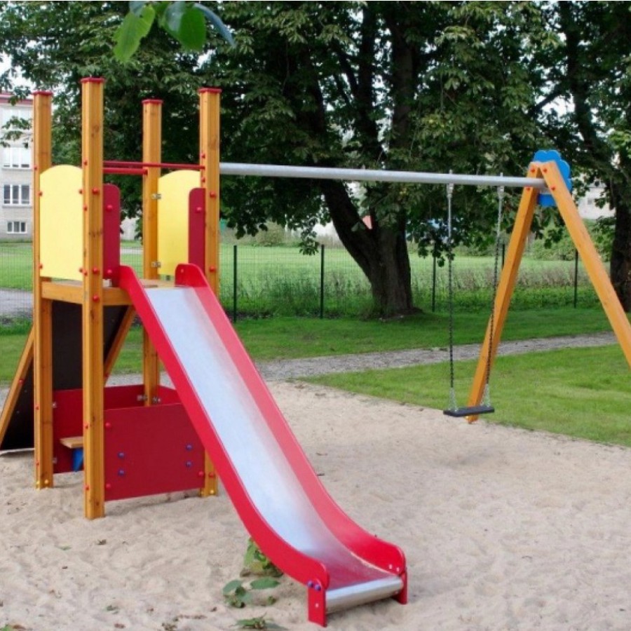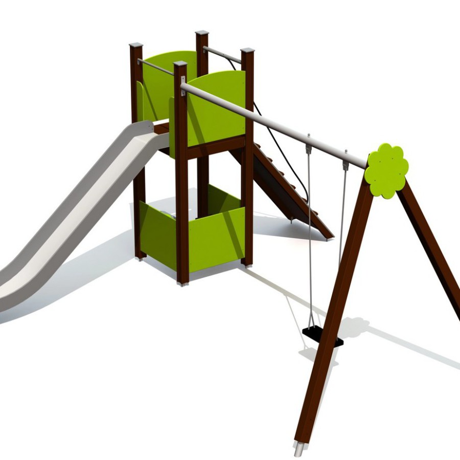Die Spielanlage vereint Rutsche, Stufenleiter und Schaukel in einem – robust, attraktiv und ideal für Kinder ab 4 Jahren.