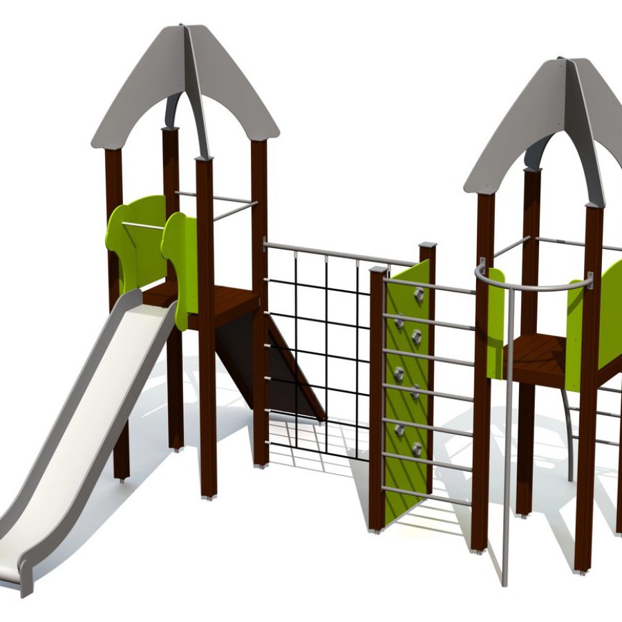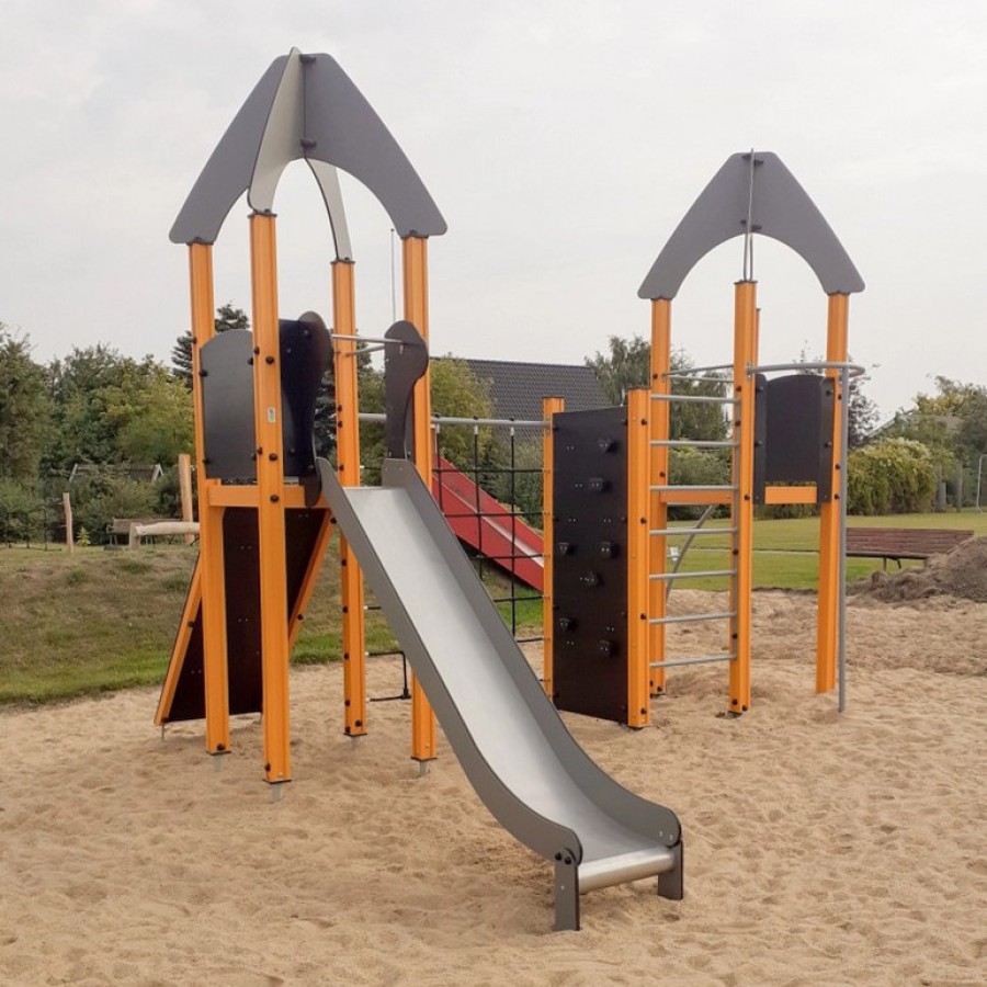 Zwei Plattformen verbunden durch Kletterelemente wie Netz, Leiter, Kletterwand inkl. Rutsche und Feuerwehrstange.